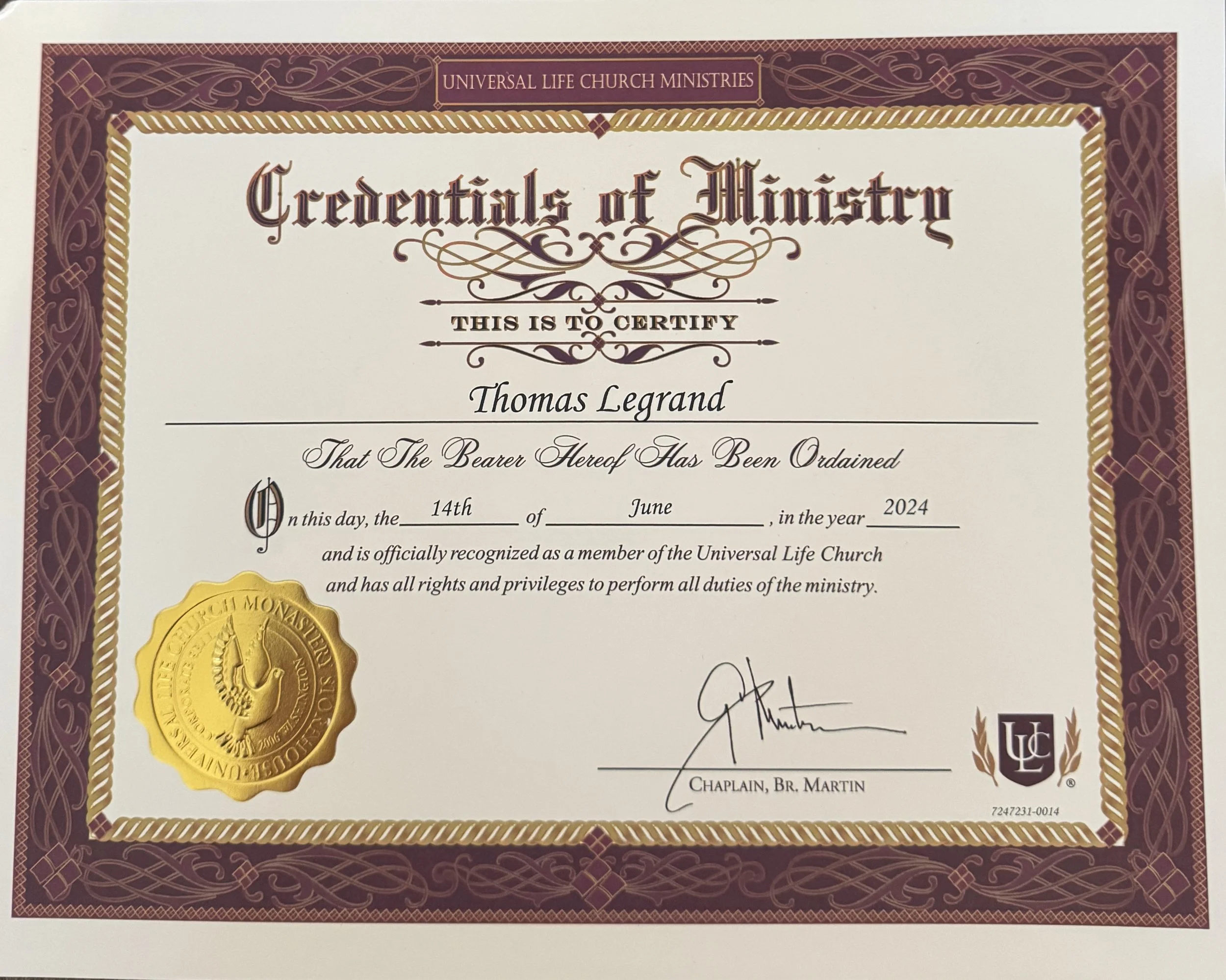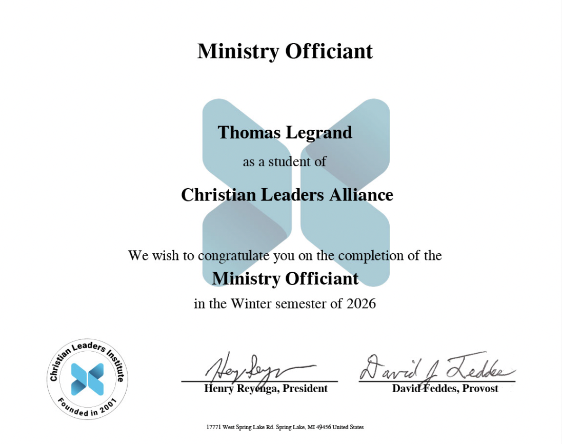 (Certificate of Ministry from the Christian Leaders Alliance)